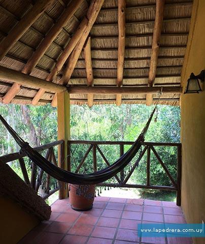 En la misma planta alta hay una hermosa terraza techada con hamacas desde donde se puede disfrutar el entorno arbolado. Es el lugar ideal para un buen relax tanto durante el día como en la noche. En el frente de la casa hay un lugar con sombra para estacionar.