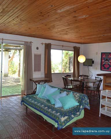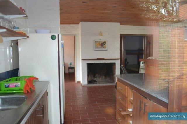 Adentro: espacio integrado; cocina-estar con estufa a leña, y sofa. Microondas, lavarropas, cocina a supergas y heladera. Buen equipamiento de cubiertos, vasos y copas, fuentes, tazas, ollas afilador de cuchillos, etc.