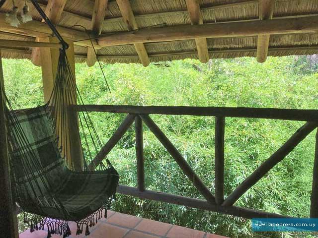En la misma planta alta hay una hermosa terraza techada con hamacas desde donde se puede disfrutar el entorno arbolado. Es el lugar ideal para un buen relax tanto durante el día como en la noche. En el frente de la casa hay un lugar con sombra para estacionar.