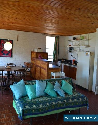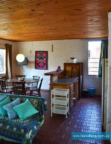 Adentro: espacio integrado; cocina-estar con estufa a leña, y sofa. Microondas, lavarropas, cocina a supergas y heladera. Buen equipamiento de cubiertos, vasos y copas, fuentes, tazas, ollas afilador de cuchillos, etc.